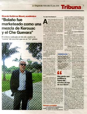 "Bolaño fue marketeado como una mezcla de Kerouac y el Che Guevara" [entrevista] [artículo] / Juan Carlos Ramírez F. La Segunda (Diario : Santiago, Chile)-- jul. 15, 2015, p. 7. .