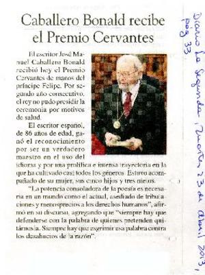Caballero Bonald recibe el Premio Cervantes. [artículo] La Segunda (Diario : Santiago, Chile)-- abr. 23, 2013, p. 33. .
