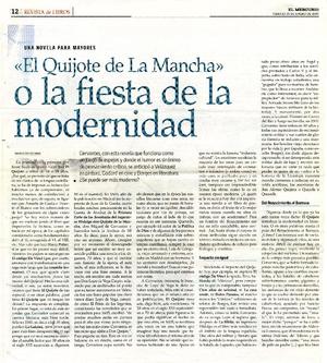 "El Quijote de La Mancha" o la fiesta de la modernidad [artículo] / Mauricio Electorat. El Mercurio (Diario : Santiago, Chile)-- ene. 21, 2005, p. 12-13 (suplemento "Revista de libros") .