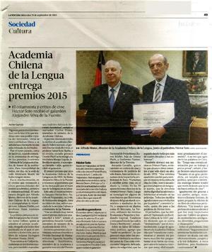 Academia Chilena de la Lengua entrega premios 2015 [artículo] / Javier García. La Tercera (Diario : Santiago, Chile)-- septiembre 23, 2015, página 49. .