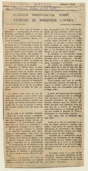 Acuciosa investigación sobre escritos de Monseñor Larraín. [artículo] La Mañana (Talca, Chile)-- dic. 3, 1976, p. 3. .