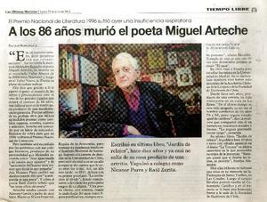 A los 86 años murió el poeta Miguel Arteche [artículo] / Natalia Bobadilla Z. Las Últimas Noticias (Diario : Santiago, Chile)-- jul. 23, 2012, p. 49. .