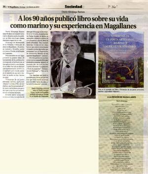 A los 90 años publicó libro sobre su vida como marino y su experiencia en Magallanes [artículo] El Magallanes (Diario : Punta Arenas, Chile) feb. 1, 2015, p. 36 .