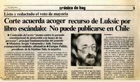 Corte acuerda acoger recurso de Luksic por libro escándalo: no puede publicarse en Chile. [artículo] La Segunda (Diario : Santiago, Chile)-- mayo 27, 1993, p. 3. retr. .