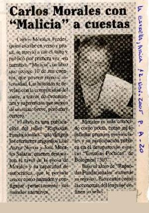 Carlos Morales con "Malicia" a cuestas [artículo]. La Estrella (Diario: Arica, Chile) nov. 12, 2005, p. A-20 .