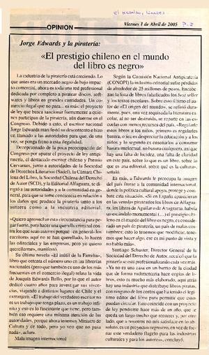 Jorge Edwards y la piratería: "El prestigio chileno en el mundo del libro es negro" [artículo]. El Heraldo (Linares, Chile) abr. 1, 2005, p. 2 .