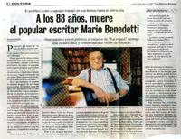 A los 88 años, muere el popular escritor Mario Benedetti [artículo]. Las Ultimas Noticias (Diario : Santiago, Chile)-- mayo 18, 2009, p. 42. .