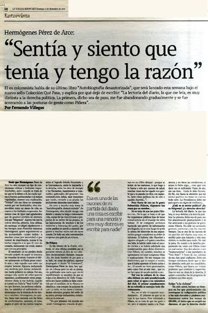 "Sentía y siento que tenía y tengo la razón" [entrevista] [artículo] / Fernando Villegas. La Tercera (Diario : Santiago, Chile)-- diciembre 6, 2009, páginas 18-19. .