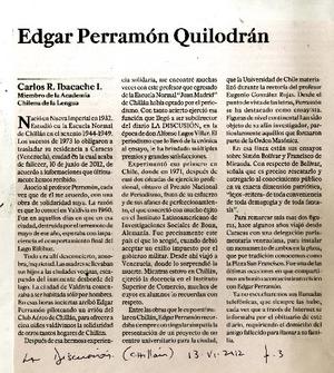 Edgar Perramón Quilodrán [artículo] / Carlos R. Ibacache I. La Discusión (diario : Chillán, Chile)-- jun. 13, 2012, p. 3. .