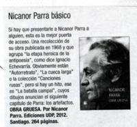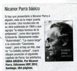 Nicanor Parra básico [artículo] Juan Carlos Ramírez F. La Segunda (Diario : Santiago, Chile)-- nov. 13, 2012, p. 31 .
