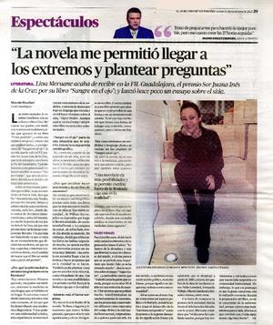 "La novela me permitió llegar a los extremos y plantear preguntas" (entrevista) [artículo] / Marcelo Macellari. El Mercurio de Valparaíso (Diario : Valparaíso, Chile)-- nov. 29, 2012, p. 29. .