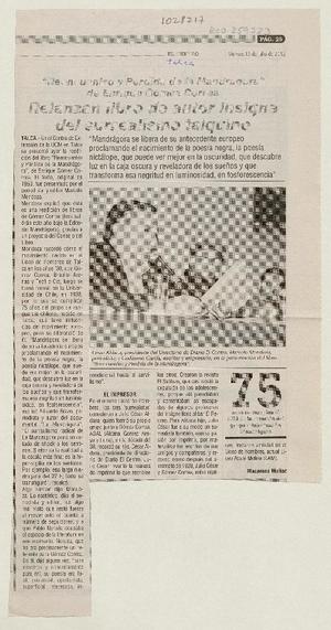 Relanzan libro de autor insigne del surrealismo talquino [artículo] / Macarena Muñoz. El Centro (diario : Talca, Chile)-- jul. 13, 2012, p. 25. .