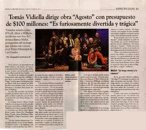 Tomás Vidiella dirige obra "Agosto" con presupuesto de $100 millones: "Es furiosamente divertida y trágica". [artículo] Alejandra Valdivieso P. La Segunda (Diario : Santiago, Chile)-- oct., 23, 2012, p. 33 .