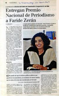 Entregan Premio Nacional de Periodismo a Faride Zerán. [artículo]/ Alejandra Muñoz C. La Tercera (Diario: Santiago, Chile) ago. 23, 2007, p. 16 .