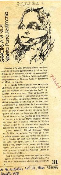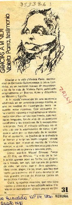 Gracias a la vida, Violeta Parra, testimonio [artículo] La Bicicleta (Revista : Santiago, Chile) no. 14 (ago. 1981) p. 31. retr. .
