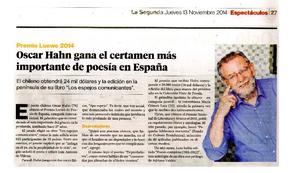 Oscar Hahn gana el certamen más importante de poesía en España [artículo] / La Segunda (Diario : Santiago, Chile)-- nov. 13, 2014, p. 27 .