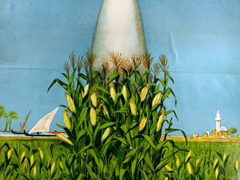 Pastizales con vacas y la rivera del Nilo con cosechas de algodón empleó la propaganda de chilena en ese país para mejorar la comercialización de este producto.