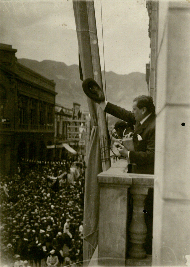 «Don Arturo Alessandri saludando al pueblo de Antofagasta desde los balcones de la Intendencia». Sucesos 949, 2 de diciembre.