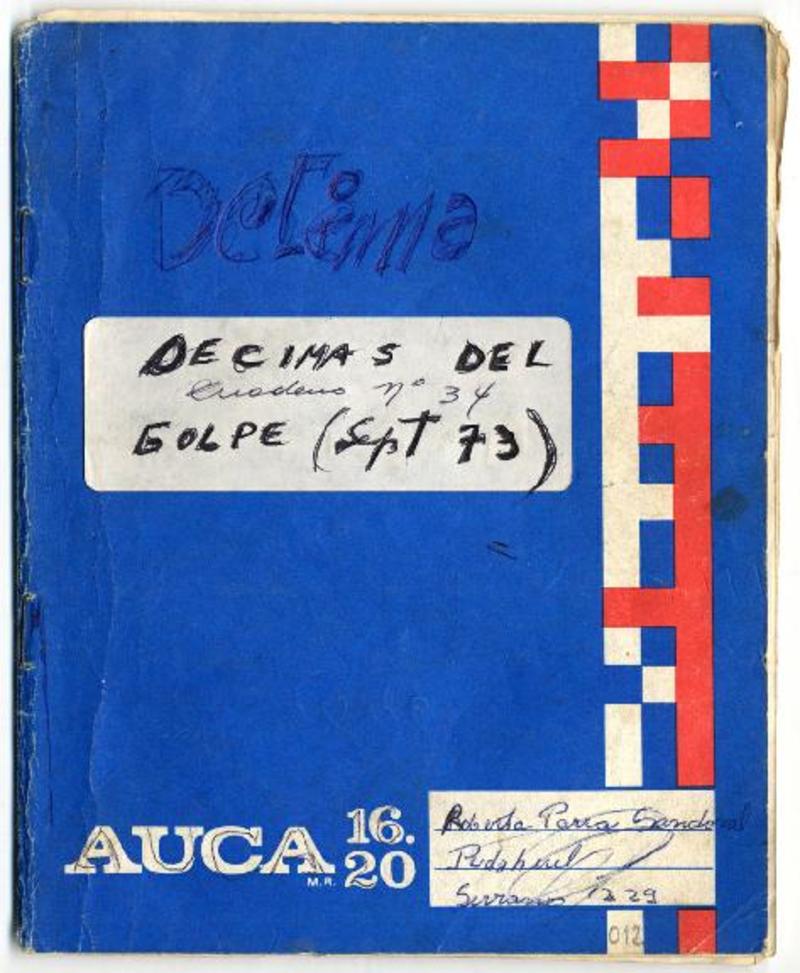 Décimas del Golpe (sept.'73) cuaderno no. 34 / [manuscrito] : Roberto Parra Sandoval. [Chile?] : [Editor no identificado], [197-?] 46 páginas ; 20 cm. .
