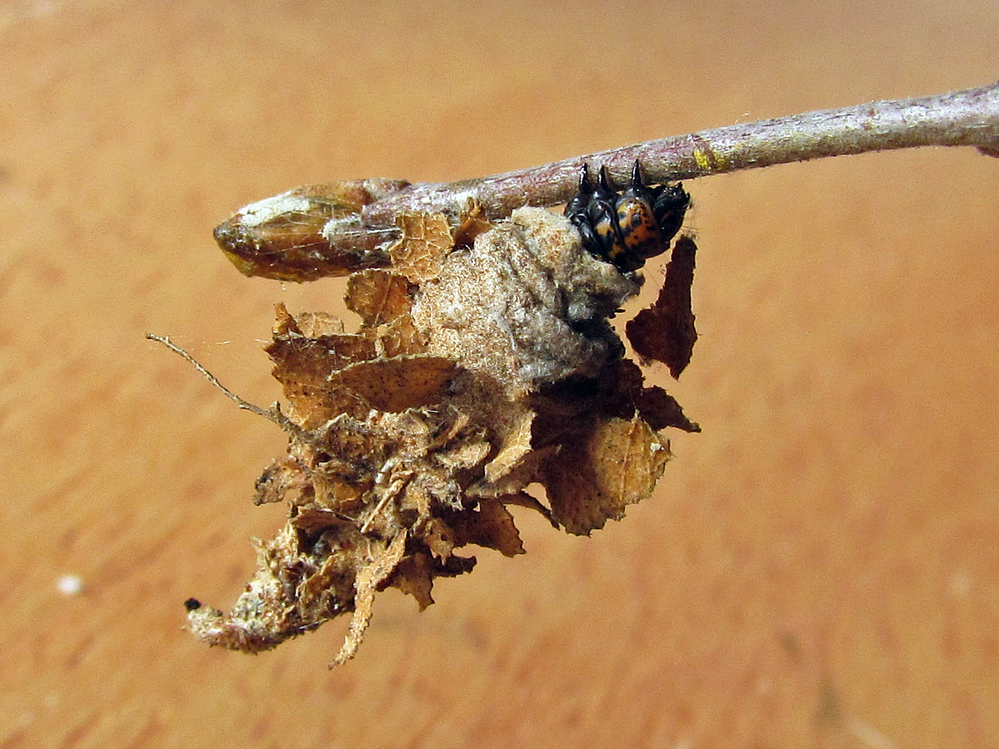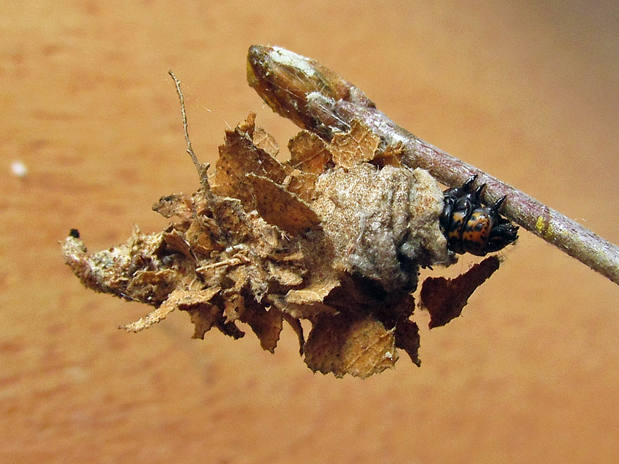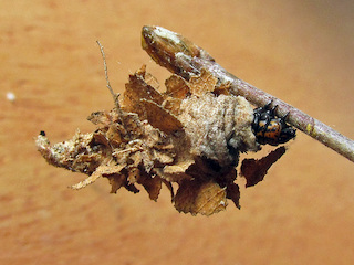 Capullos de Thanatopsyche chilensis en su capullo, a) en mirtácea, b) en manzano.