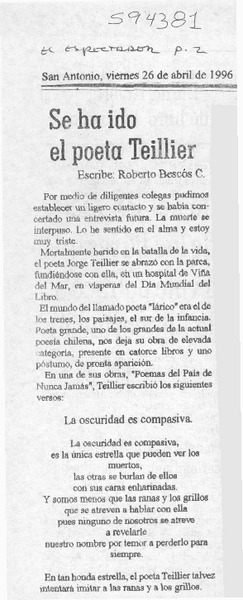 Se ha ido el poeta Teillier [artículo] Roberto Bescós C.