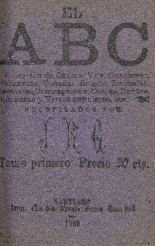El ABC : colección de cantos, vals, canciones, habaneras, tonadas, brindis, zarzuelas, serenatas, contrapuntos, cuecas, danzas, romanzas y versos populares, etc. : [tomo primero] recopilados por J.R.G.