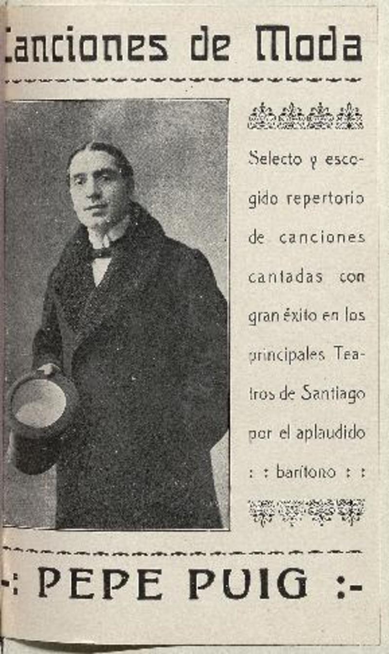 Canciones de moda : el rey de los cancioneros : tomo segundo : canciones populares de gran éxito : selecto y escogido repertorio de canciones cantadas con gran éxito en los principales teatros de Santiago y Valparaíso por el aplaudido barítono Pepe Puig.