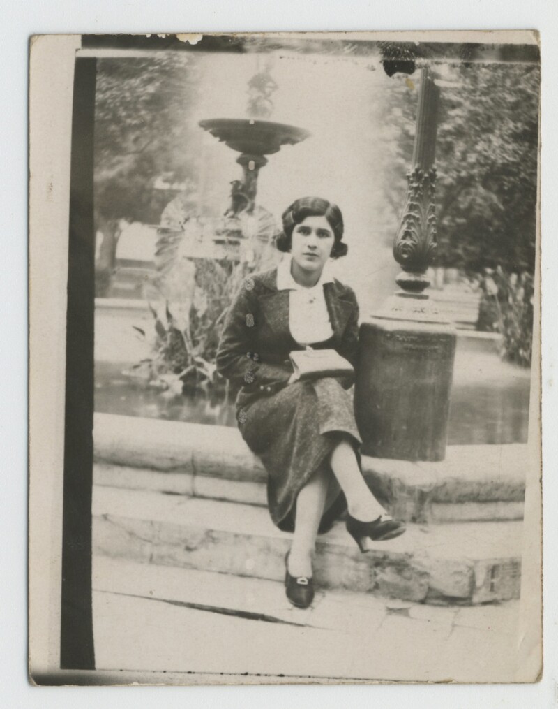 Mujer sentada en pileta de Plaza de Los Andes [Fotografía]