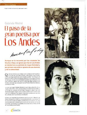El Paso de la gran poetisa por Los Andes [artículo]. Valparaíso tips (Revista : Chile)-- no. 7 (2008) p. 42, 44-45. .