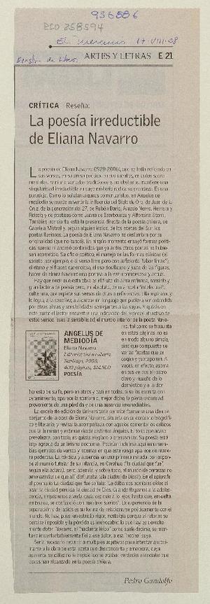 La poesía irreductible de Eliana Navarro [artículo] / Pedro Gandolfo. El Mercurio (Diario : Santiago, Chile)-- ago. 17, 2008, p. E21 (Revista de libros) .