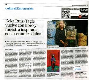 Keka Ruiz-Tagle vuelve con libro y muestra inspirada en la cerámica china [artículo] / Denisse Espinosa. La Tercera de La Hora (Diario : Santiago, Chile)-- mar. 9, 2013, p. 94. .