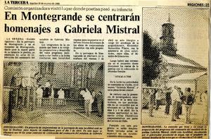 En Montegrande se centrarán homenajes a Gabriela Mistral Comisión organizadora visitó lugar donde poetisa pasó su infancia [artículo] : El Día (diario : La Serena, Chile)-- abr. 10, 1982, p. 3. retr. .