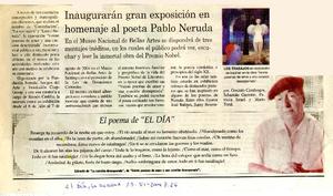 Inaugurarán gran exposición en homenaje al poeta Pablo Neruda [artículo] El Día (diario : La Serena, Chile)-- jun. 15, 2004, p. 26. retr. .