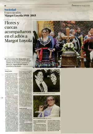 Flores y cuecas acompañaron en el adiós a Margot Loyola [artículo] / Jimmy Gavilán. La Tercera (Diario : Santiago, Chile)-- agosto 5, 2015, página 50-51 (suplemento "Sociedad") .