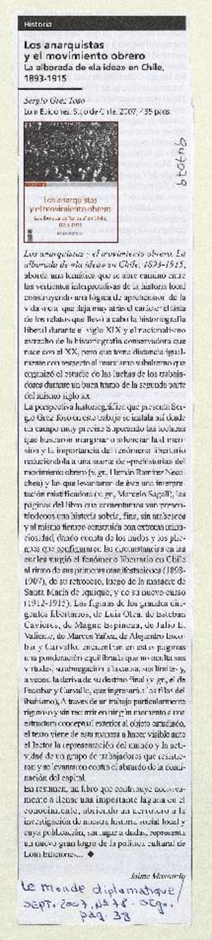 Los anarquistas y el movimiento obrero [artículo] / Jaime Massardo. Le Monde Diplomatique (Chile)-- no. 78 (sept. 2007) p. 38. .