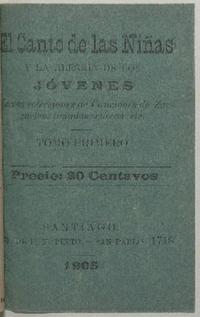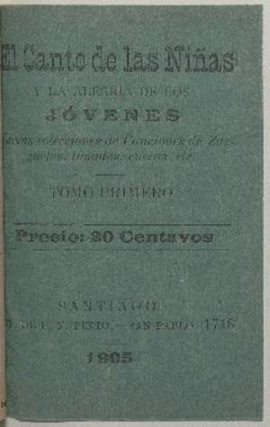 El Canto de las niñas y la alegría de los jóvenes : nuevas colecciones de canciones de zarzuelas, tonadas, cuecas, etc. : tomo primero. Santiago : Imp. de P. N. Pinto, 1905. 23 páginas ; 13 cm. .