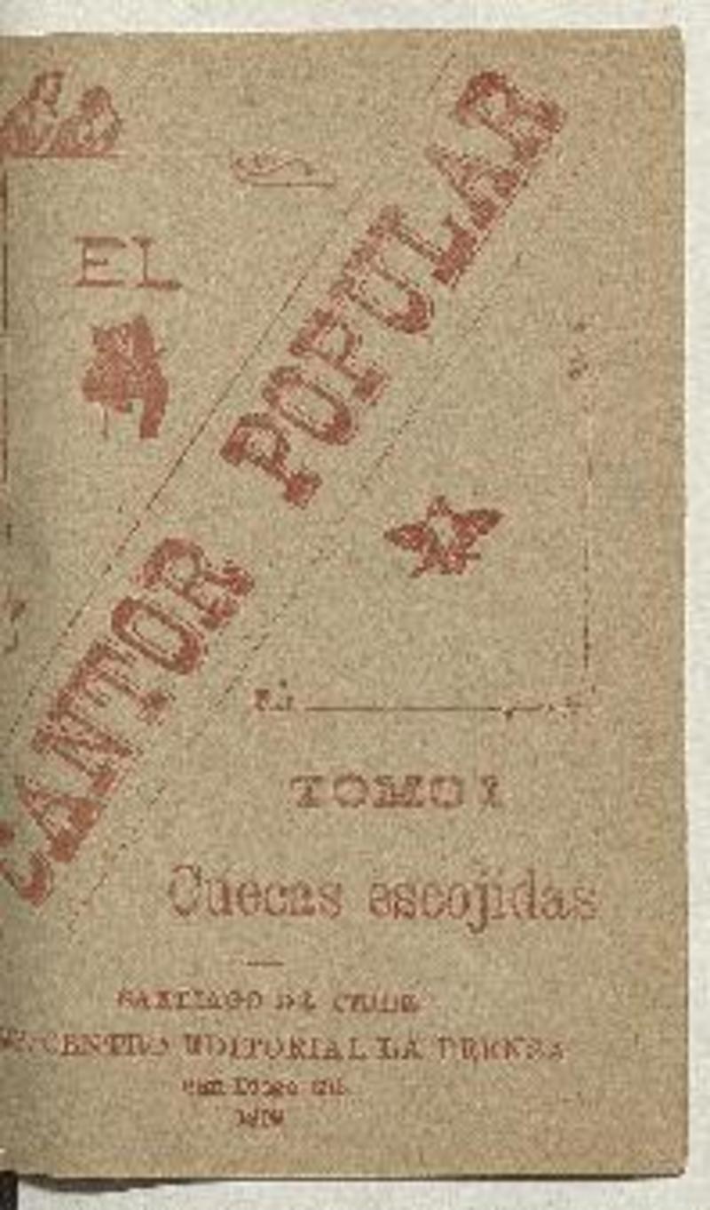 El Cantor popular : cuecas escojidas : tomo I. Santiago de Chile : Imprenta del Centro Editorial La Prensa, 1903. 32 páginas : ilustraciones ; 12 cm. .