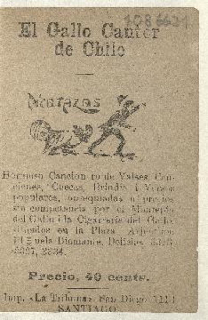 El gallo cantor de Chile : picotazos : hermoso cancionero de valses, canciones, cuecas, brindis i versos populares, obsequiadas a precios sin competencia por el Montepío del Gallo i la Cigarrería del Gallo, situados en la Plaza Arjentina Plazuela Diamante, Delicias 3323, 3327, 3334. Santiago : Imp. "La Tribuna", [1907?] 32 páginas ; 13 cm. .