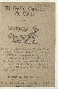 El gallo cantor de Chile : picotazos : hermoso cancionero de valses, canciones, cuecas, brindis i versos populares, obsequiadas a precios sin competencia por el Montepío del Gallo i la Cigarrería del Gallo, situados en la Plaza Arjentina Plazuela Diamante, Delicias 3323, 3327, 3334.