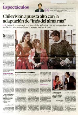 Chilevisión apuesta alto con la adaptación de "Inés del alma mía" [artículo] / F. Arbulú. El Mercurio de Valparaíso (Diario : Chile)-- abr. 9, 2015, p. 26. .