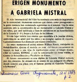 Erigen monumento a Gabriela Mistral [artículo] Semanario Oasis (Chuquicamata, Chile)-- mayo 12, 1979, p. 2. .