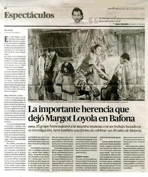 La importante herencia que dejó Margot Loyola en Bafona [artículo] / Flor Arbulú. Crónica Chillán (Diario : Chillán, Chile)-- septiembre 16, 2015, página 24. El Mercurio (Diario : Valparaíso, Chile)-- .