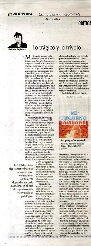 Lo trágico y lo frívolo [artículo] / Patricia Espinosa Las Últimas Noticias (Diario : Santiago, Chile) enero 16, 2015, página 72 .