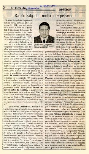 Ramón Salgado: nocturno espejismo [artículo]/ Jaime Gatica Jorquera. El Heraldo (Diario: Santiago, Chile) sept. 6, 2005, p. 2 .