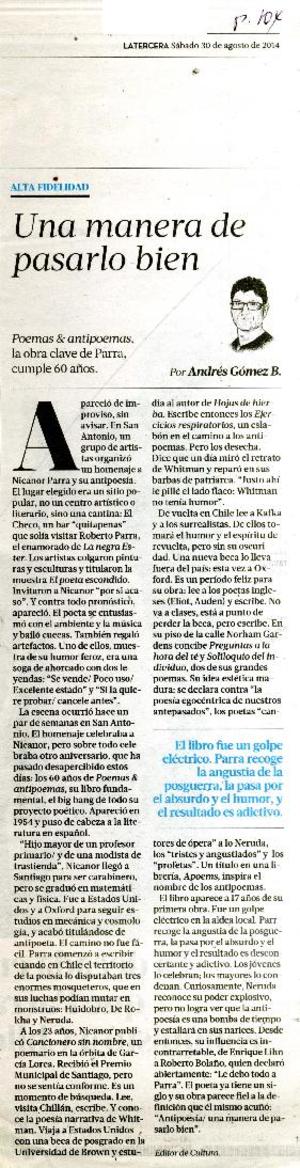 Una manera de pasarlo bien [artículo] / Andrés Gómez B. La Tercera (Diario : Santiago, Chile)-- ago. 30, 2014, p. 104 .