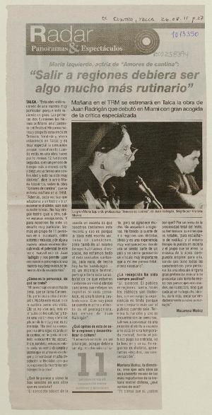 Salir a regiones debiera ser algo mucho más rutinario (entrevista) [artículo] / Macarena Muñoz. El Centro (Diario : Talca, Chile)-- ago. 26, 2011, p. 27 .