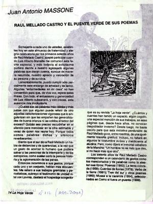 Raúl Mellado Castro y el puente verde de sus poemas [artículo] Juan Antonio Massone La Hoja Verde (Santiago) no. 116 (ago. 2001) p. 14-15 .