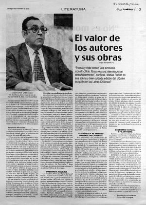 El valor de los autores y sus obras : 40 escritores contemporáneos [artículo] / Hugo Metzdorff. El Centro (Talca, Chile)-- dic. 14, 2003, p. 3. retr. .