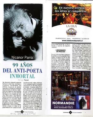 Nicanor Parra: 99 años del anti-poeta inmortal [artículo] / León Pascal La Noche (Revista : Santiago, Chile)-- n° 56 ( junio) 2013, p. 22-26 .