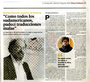 "Como todos los sudamericanos, padecí traducciones malas" [artículo] / Juan Carlos Ramírez F. La Segunda (Diario : Santiago, Chile)-- ago. 8, 2014, p. 43 .